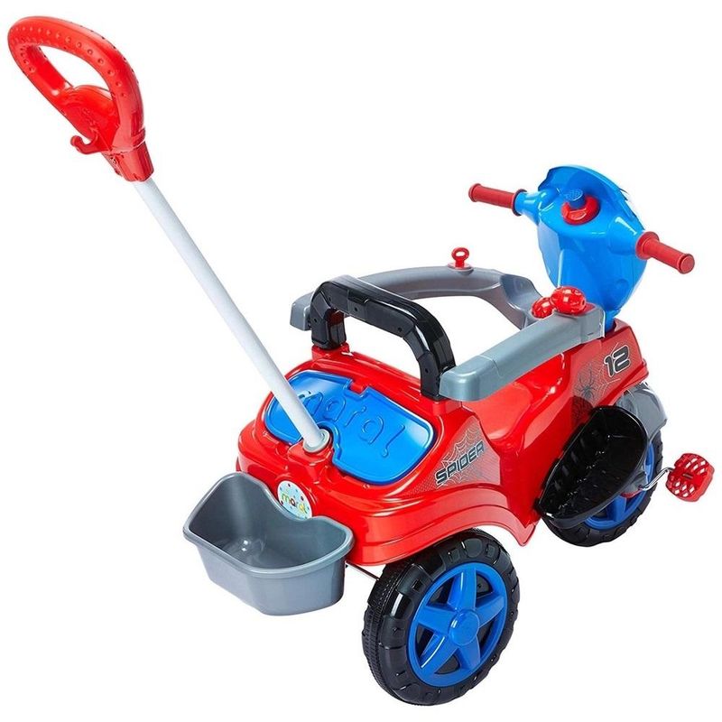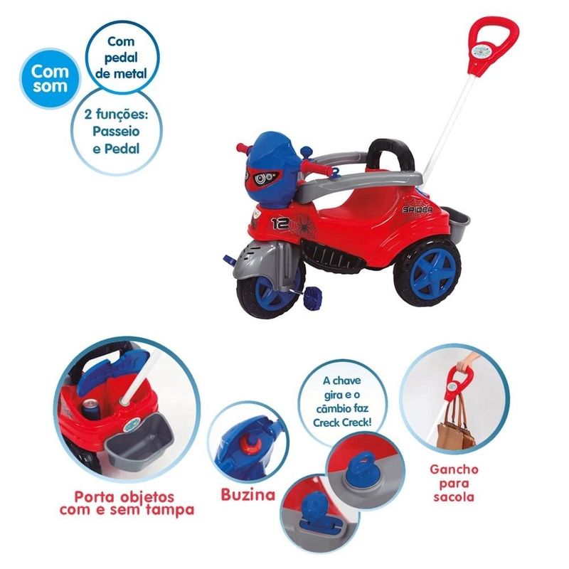 Triciclo Passeio e Pedal Infantil Maral Baby City Spider 2 em 1 - com Empurrador e Buzina O Triciclo Infantil Baby City Spider da Maral é um verdadeiro parceiro de aventuras para as primeiras descobertas do seu filho. Com visual marcante e detalhes inspirados em super-heróis, esse veículo infantil multifuncional combina diversão com funcionalidade, promovendo a autonomia e o desenvolvimento motor desde cedo. Pensado para acompanhar o crescimento da criança, o Modelo Baby City Spider funciona em dois modos: Passeio e Pedal. Enquanto o adulto conduz com segurança usando a haste direcional, o pequeno curte o trajeto com conforto. Quando chega a hora da independência, basta remover a haste e o apoio de pés para que a criança pedale sozinha com liberdade. O Triciclo Maral Baby City Spider traz diferenciais que fazem a diferença no dia a dia. O pedal em metal garante resistência superior, e o guidão com punhos emborrachados proporciona mais firmeza nas mãos pequenas. O câmbio com som mecânico “creck-creck” e a chave giratória estimulam a imaginação, tornando cada passeio uma brincadeira completa. Além disso, o Kit Baby City Spider oferece praticidade para os responsáveis: o porta-objetos com tampa removível acomoda pequenos itens como suquinhos ou mamadeiras, e o gancho na haste suporta sacolas de até 1,5 kg. Tudo isso com a qualidade dos brinquedos Maral, reconhecida por sua durabilidade e acabamento seguro. Este conjunto de triciclo infantil é uma escolha inteligente para quem busca um brinquedo robusto, versátil e com apelo visual cativante. O Baby City Spider vai muito além de um simples velocípede — ele é uma experiência completa de movimento, aprendizado e alegria! Vantagens do Produto Pedal em metal resistente e durável Apoio de pés removível para maior adaptabilidade Haste direcional com controle de direção pelo adulto Guidão com punhos emborrachados e buzina Porta-objetos com tampa removível Chave giratória e câmbio com som mecânico Funções Passeio e Pedal em um só produto Gancho na haste para pendurar sacola de até 1,5 kg Estrutura forte e estável, ideal para uso frequente Visual temático divertido com cores vibrantes Itens Inclusos na Embalagem 1 Triciclo Baby City Spider Maral 1 Haste direcional removível 1 Apoio de pés 1 Anel de proteção 1 Porta-objetos com tampa Garanta agora o Triciclo Baby City Spider e proporcione momentos únicos de movimento, desenvolvimento e diversão para o seu pequeno! Certificação InMetro: