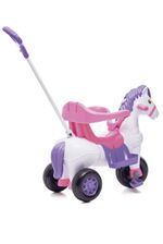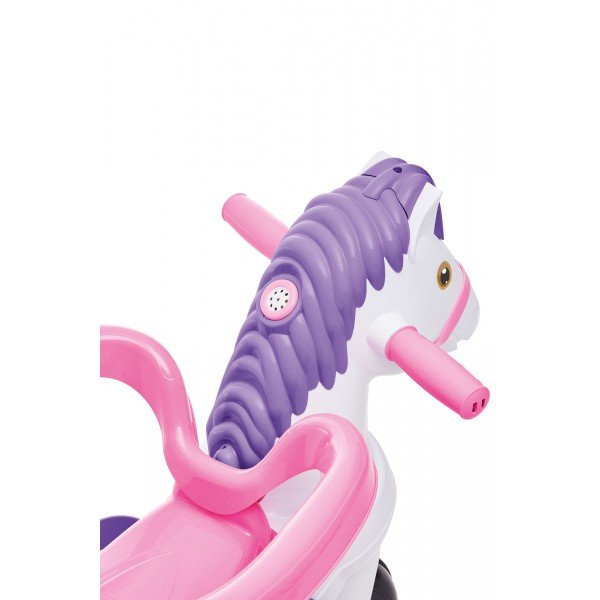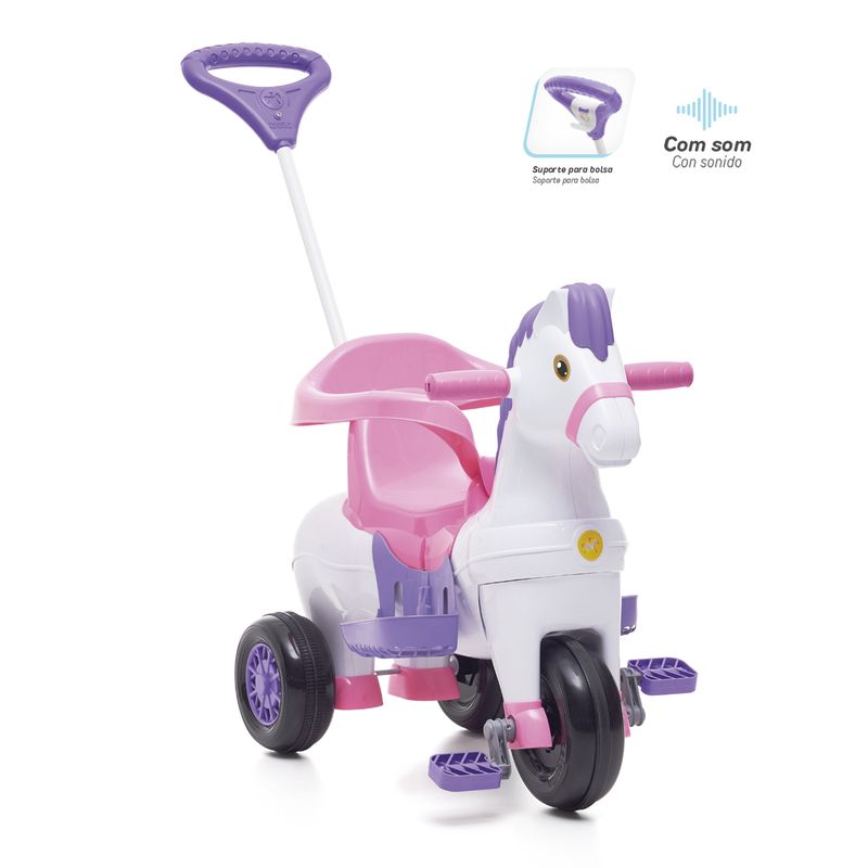 O cavalinho é um brinquedo 2 em 1, acompanha as fases de crescimento da criança com conforto e segurança. Na primeira fase, o apoio de pés mantém as perninhas do bebê apoiadas e, a estabilidade do corpo é garantida pelo cercado de proteção, também removível. Já na fase mais independente do bebê, retira-se o apoio de pés e cercado de proteção para a diversão do passeio pedal. Pensando nessa independência para a diversão do pedal, o Potó foi projetado com roda dianteira acompanhada de borracha para evitar derrapar.