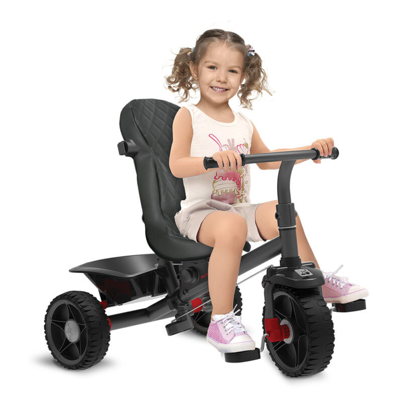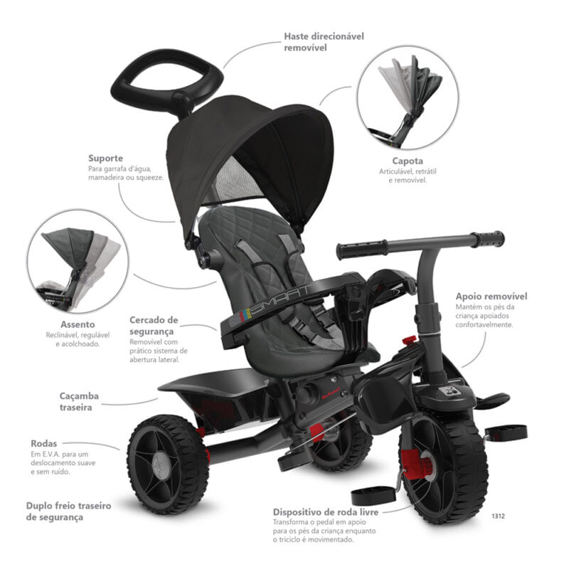 Dispositivo de roda livre: Transforma o pedal em apoio para os pés da criança enquanto o triciclo é movimentado.