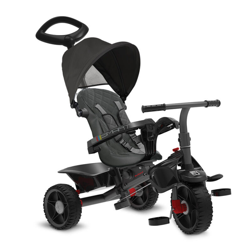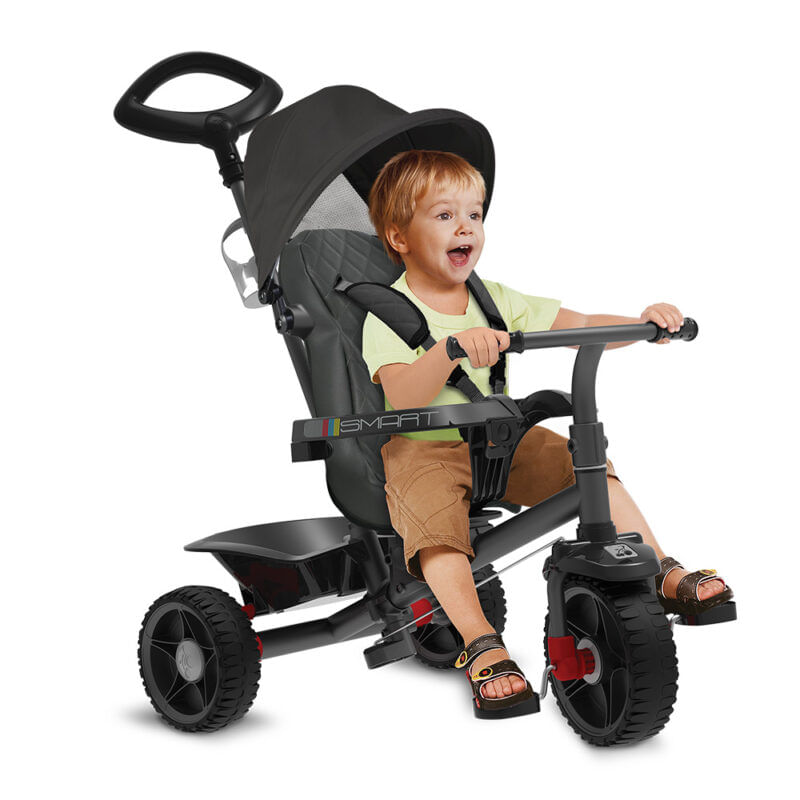 FUNÇÃO PASSEIO: O adulto utiliza a haste direcionável para conduzir o triciclo. Basta destravar o dispositivo de roda livre e colocar o cercado de proteção e apoio dos pés.