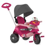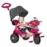 FUNÇÃO PEDAL: Permite à criança pedalar livremente como um triciclo convencional. Basta travar o dispositivo de roda livre, remover a haste, o cercado de proteção e o apoio dos pés. Chip sonoro. Guidão com limitador de giro e porta celular ( CELULAR NÃO INCLUSO) Haste direcionável e removível. Dispositivo de roda livre: Transforma o pedal em apoio para os pés da criança enquanto o triciclo é movimentado. Freio traseiro de segurança. Rodas com anel antiderrapante. Assento reclinável com três posições. Cinto de segurança. Suporte para garrafa d'água, mamadeira ou squeeze (no cercado). Apoio para os pés removível: Mantém os pés da criança apoiados confortavelmente. Suporte para bolsa/ sacola (na alça da haste). Cercado de proteção removível com painel de atividades. Capota articulável, retrátil e removível. Idade: +12 meses. Peso máximo suportado: 30kg. Número do Registro Inmetro: 003833/2021 OCP: 0061