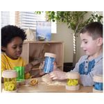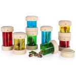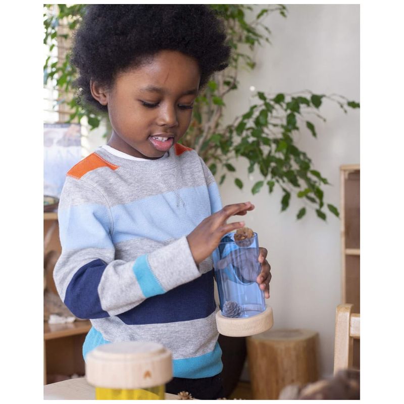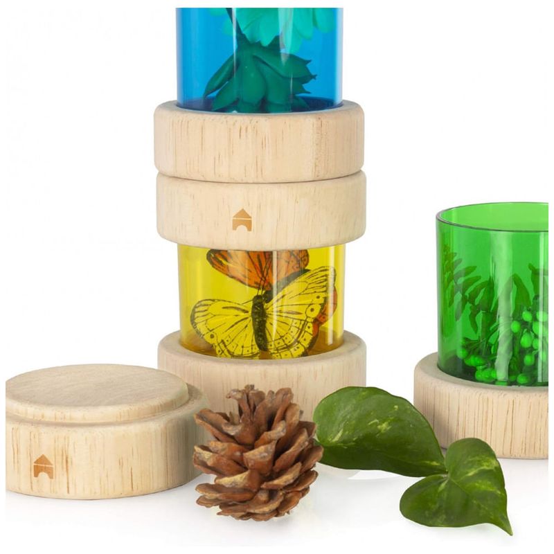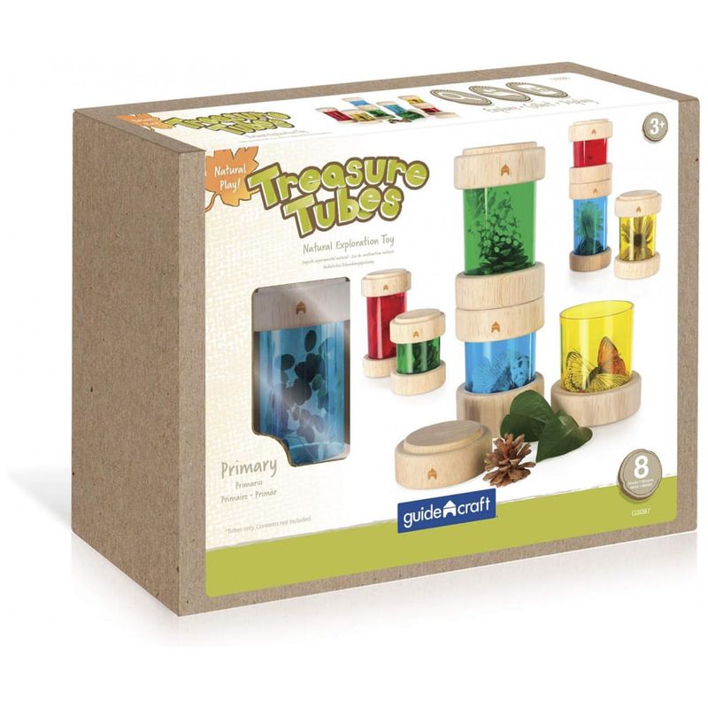 Os Treasure Tubes Primárias da Guidecraft são tubos transparentes coloridos projetados para observação e exibição de pequenos objetos como contas, folhas, brinquedos e galhos. Cada tubo possui tampa plana e removível que mantém os objetos seguros e permite empilhamento. As peças variam entre 7,5 cm de diâmetro por 8,9 cm de altura no menor tubo e 7,5 cm de diâmetro por 14,6 cm de altura no maior tubo, adequados para manipulação visual e sonora em atividades de exploração sensorial e mesa de luz. Indicados para crianças a partir de 3 anos até 10 anos, são fabricados em madeira com janelas acrílicas resistentes, garantindo durabilidade para uso contínuo. O conjunto apoia o desenvolvimento de habilidades motoras finas, reconhecimento de cores e exploração sensorial manual.?
