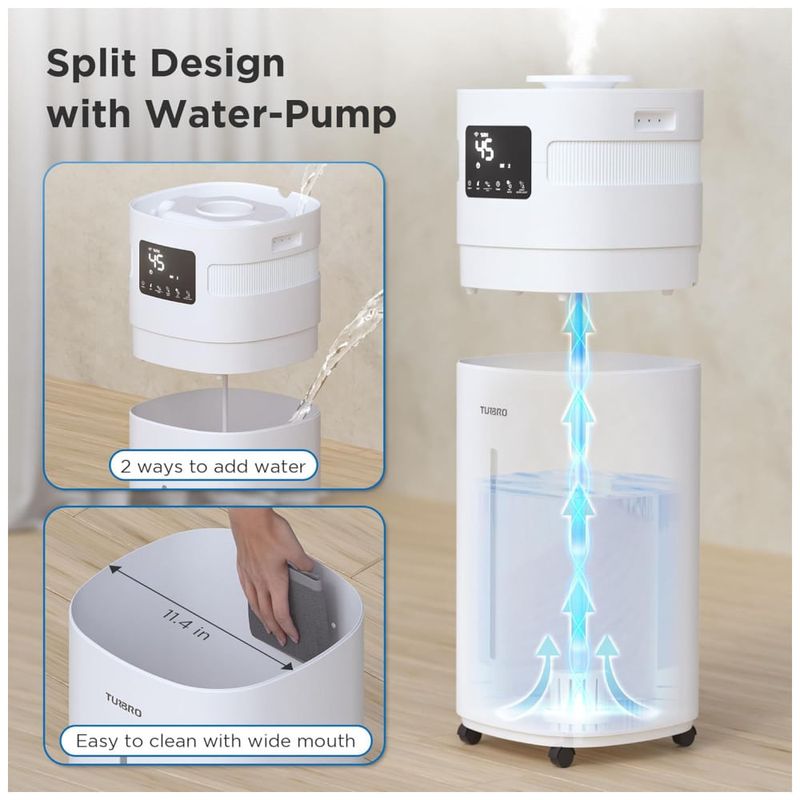 Com um tanque de água de 5,2 galões (20 litros), você pode desfrutar de até 25 a 40 horas de névoa contínua. Seu design dividido permite fácil adição de água pela parte superior, evitando vazamentos pela parte inferior.