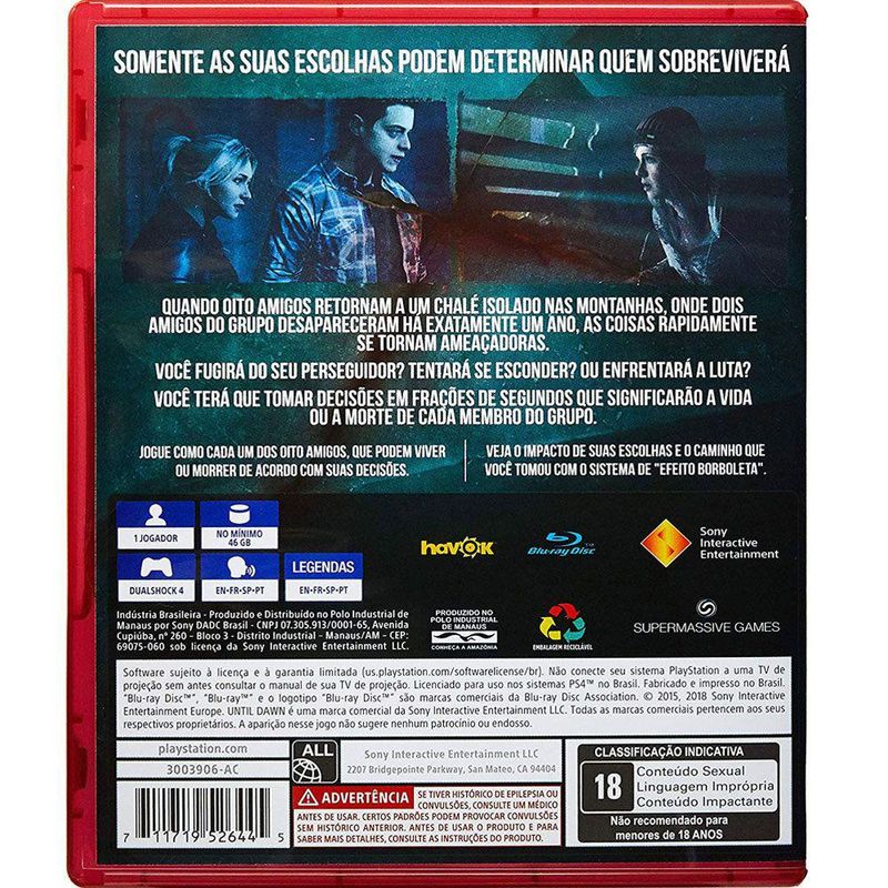 Conteúdo da Embalagem: 1 - Until Dawn Hits - Playstation 4
