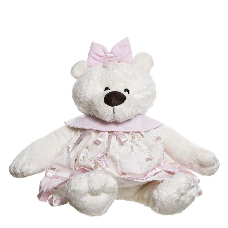 Ursa de pelúcia em material lavável e antialérgico com enchimento 100% poliéster.