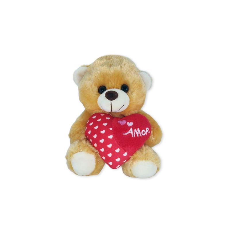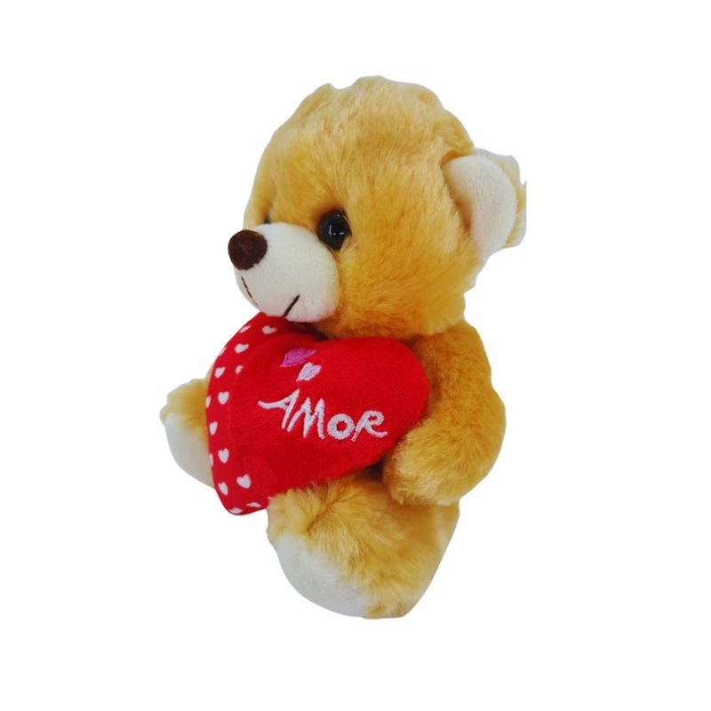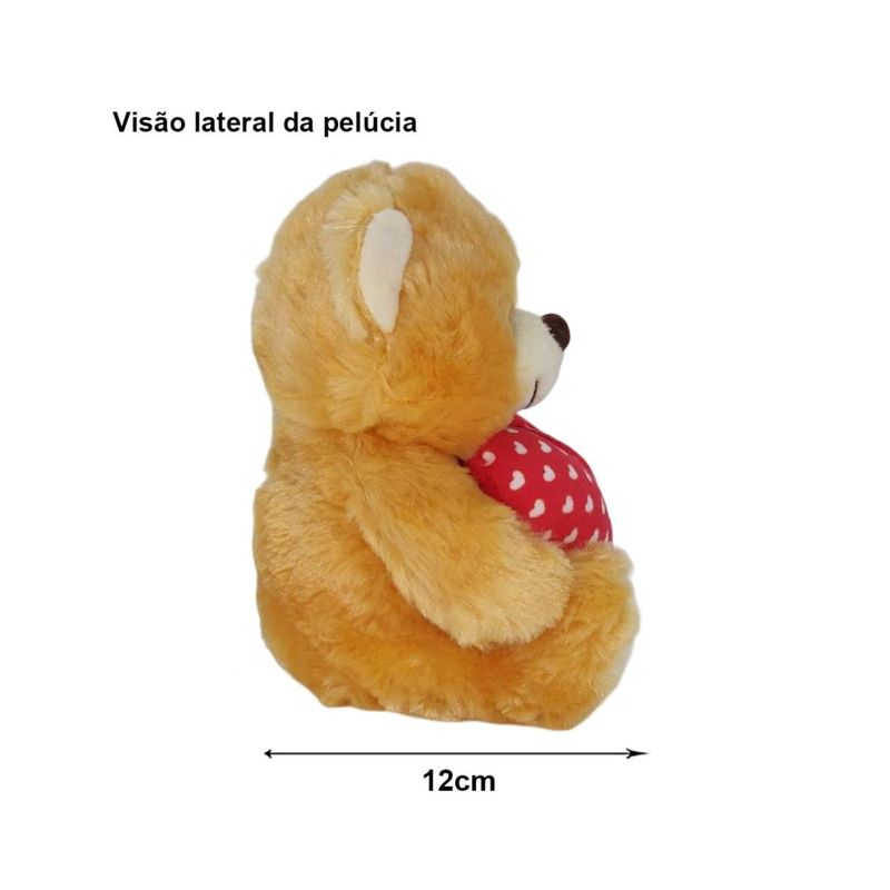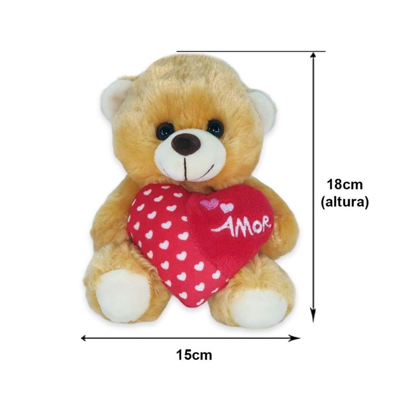 Confeccionado com material 100% poliéster e enchimento em fibra siliconada, o ursinho possui um toque extremamente macio e acabamento de alta qualidade. Na cor caramelo, ele vem segurando um coração vermelho decorado com coraçõezinhos brancos e a palavra "AMOR" bordada — um detalhe que faz toda a diferença.