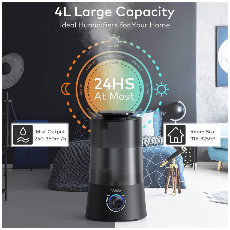 Grande capacidade de 4L e desligamento automático Com tanque de água grande de 4L, o umidificador de névoa fria permite até 24 horas de trabalho com pouca névoa. O volume máximo de névoa pode ser de até 350ml , h, adequado para salas de 30 m2. O umidificador desligará automaticamente quando ficar sem água. Não tome mais conta do umidificador por segurança