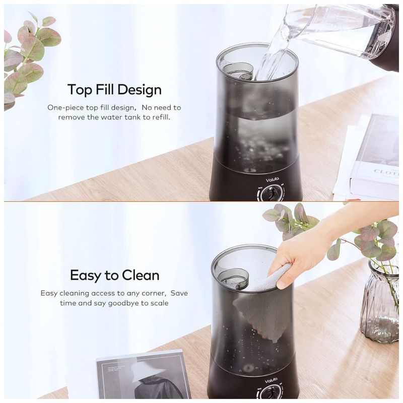 Projeto de preenchimento superior com grande abertura O umidificador é muito conveniente com o projeto de preenchimento superior. Remova a tampa para adicionar água purificada ou óleo essencial diretamente no tanque de água