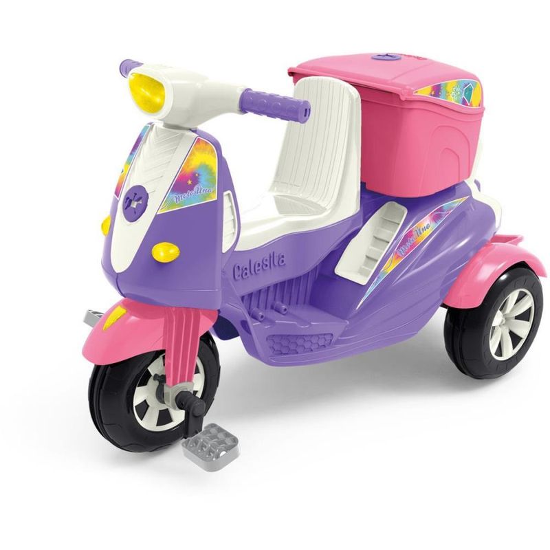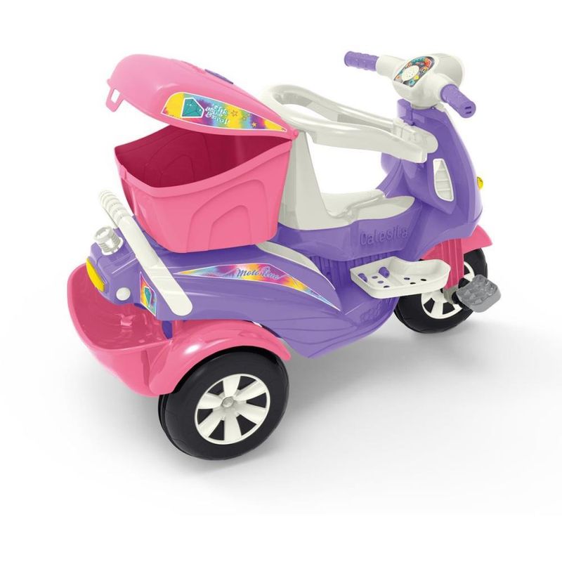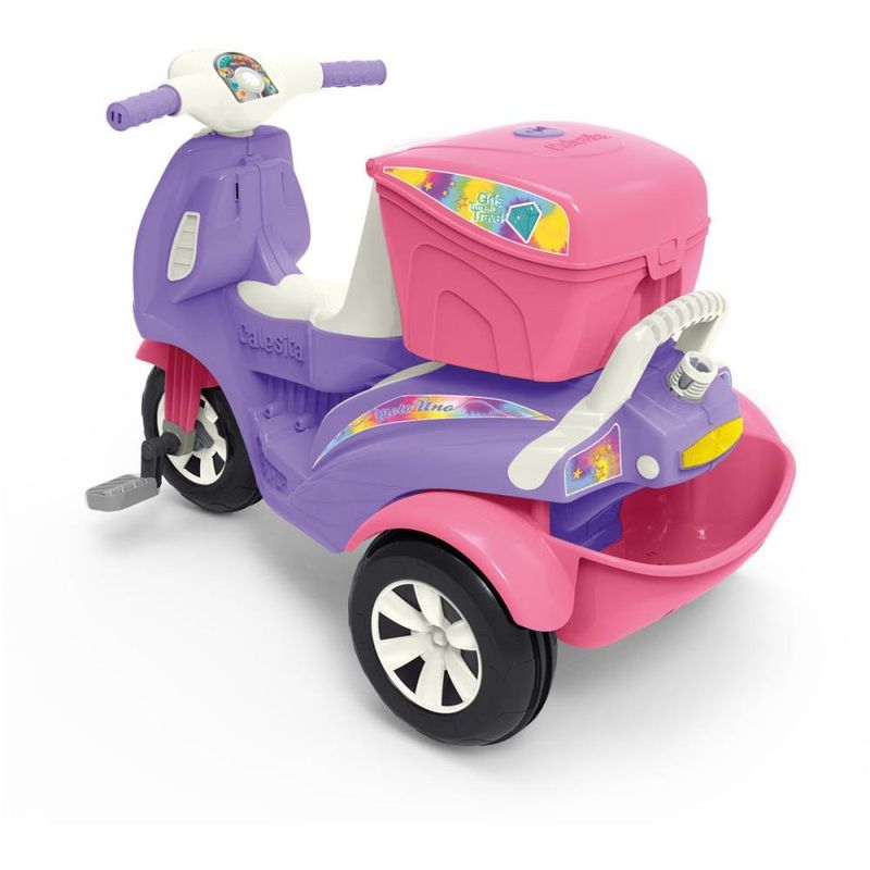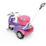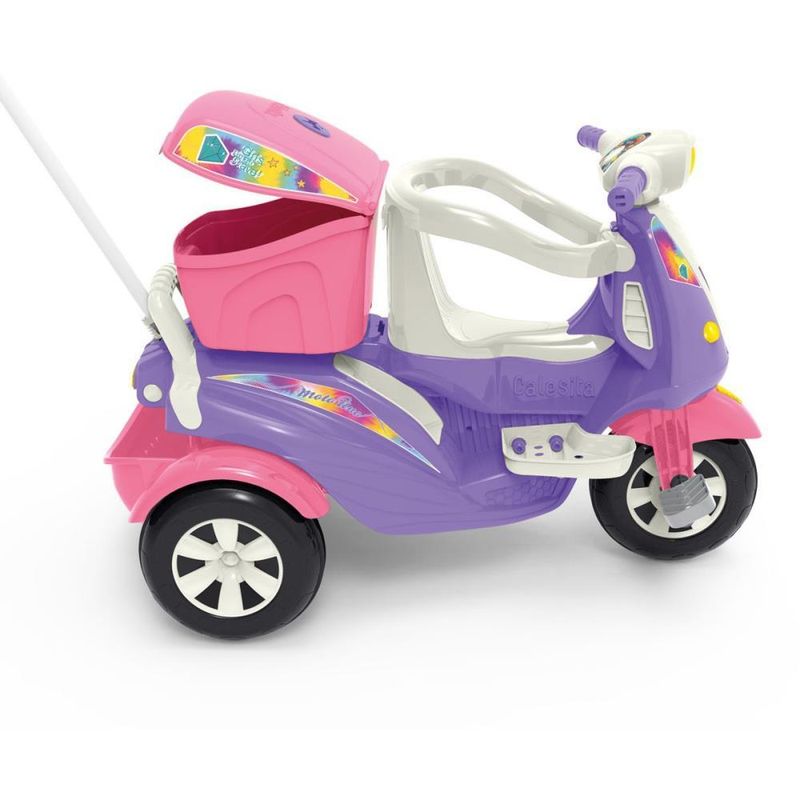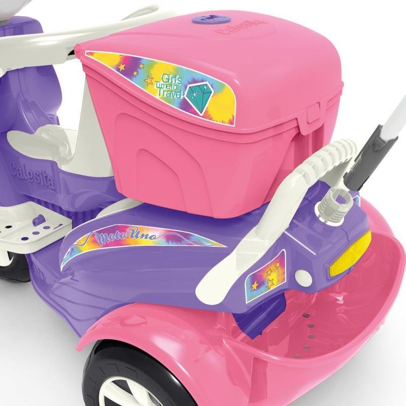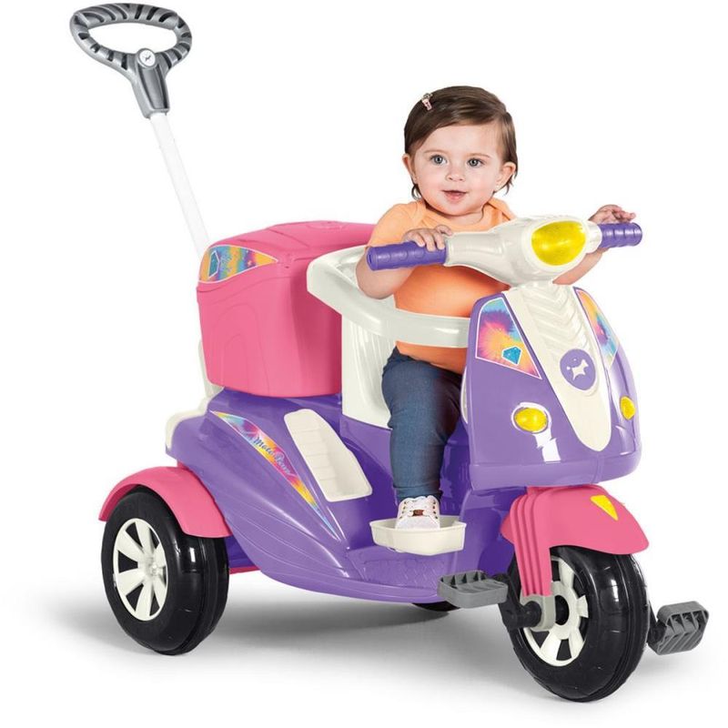 Prepare-se! A aventura sobre tres rodas vai comecar! Os pequeninos irao acelerar rumo a diversao com a nova moto da Calesita. A Moto Uno e um triciclo dois em um, para passear ou pedalar. Vem com bauzinho para guardar brinquedos, farol que acende e som divertido para estimular a imaginacao. Na versao passeio acompanha o empurrador, aro protetor e apoio de pes removivel, facil de encaixar. E para sair pedalando, basta retirar os acessorios e acionar a versao pedal. Entao a moto esta pronta para que os pequeninos explorem o passeio e sintam no rosto o vento com a Moto Uno.