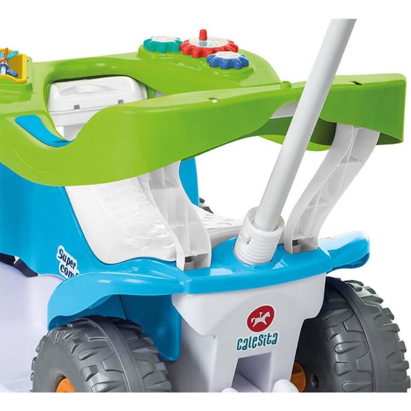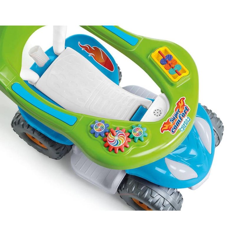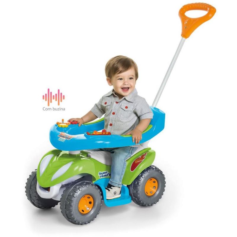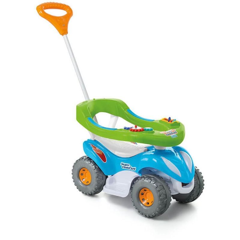 Para um passeio super confortável e divertido! O carrinho super colorido é confortável e seguro para passear ao encaixar o cabo. Enquanto passeia, o bebê pode se divertir com as atividades didáticas no aro protetor. E é um brinquedo 2 em 1! Retirando a proteção e o apoio para os pés, o volante gira e o bebê pode brincar desenvolvendo a coordenação dos movimentos e impulso. O carrinho tem buzina e o assento ainda levanta para guardar acessórios e brinquedos. Contém: 1 Super Comfort 1 Aro protetor 1 Haste 1 Empurrador 1 Suporte para os pés 1 Protetor antitombo 1 Manual de Instruções Habilidades desenvolvidas: Coordenação entre olhos e pés Coordenação motora fina – mãos e dedos Coordenação motora grossa – braços e pernas Ida