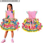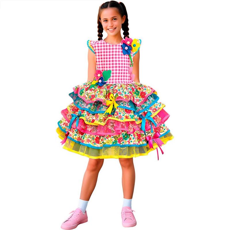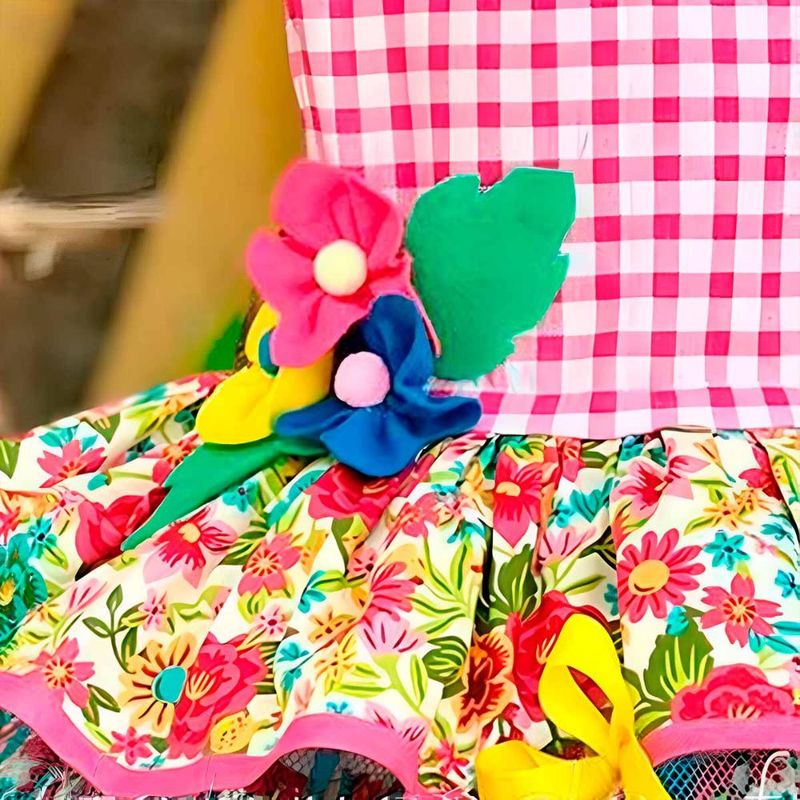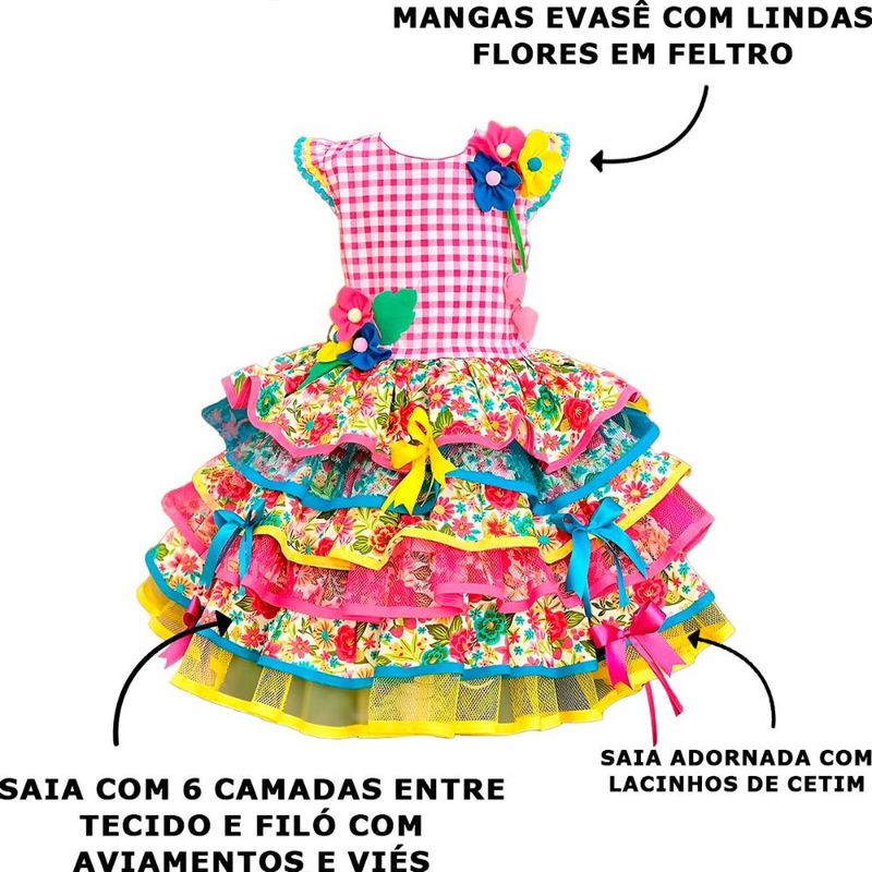 Vestido infantil Super Luxuoso de festa junina para meninas que amam se fantasiar de caipirinha, destacando-se pelas mangas evasê adornadas com lindas flores em feltro nos ombros e cintura este vestido é perfeito para festinhas de escola e dançar quadrilha. A saia possui seis camadas intercaladas entre tecido e filó, que deixam ela com bastante volume e rodada, com aviamentos e viés, complementada por lacinhos de cetim. Na parte traseira, fecho de botões de pressão garante fácil manuseio, enquanto o cinto na cintura proporciona melhor ajuste ao corpo. As camadas da saia exibem estampas florais vibrantes, conferindo um visual alegre e festivo.