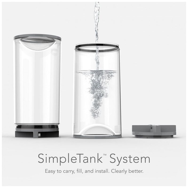 DESIGN INOVADOR O Sistema SimpleTank foi projetado para facilitar o reabastecimento e a limpeza. A alça de transporte integrada, a tampa removível e a grade de saída e o tanque transparente proporcionam um tanque de água fácil de transportar, encher e limpar.
