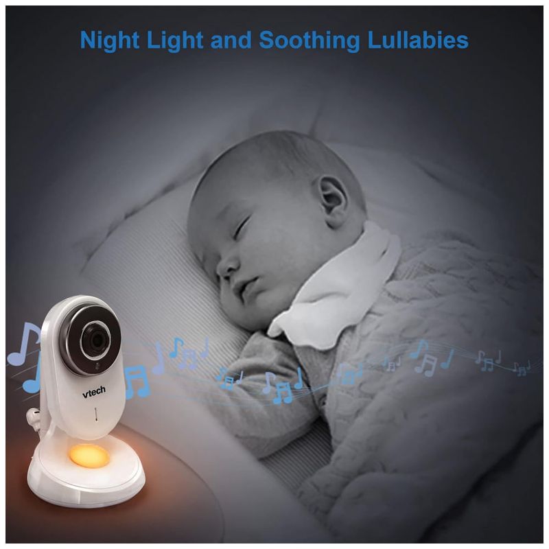Luz noturna e canções de ninar Acalme os níveis de conforto do seu bebê iluminando suavemente os espaços escuros com a luz noturna da unidade do bebê e escolha entre cinco melodias pacíficas e quatro sons ambientes calmantes para reproduzir no monitor do bebê, todos controlados pela unidade dos pais.