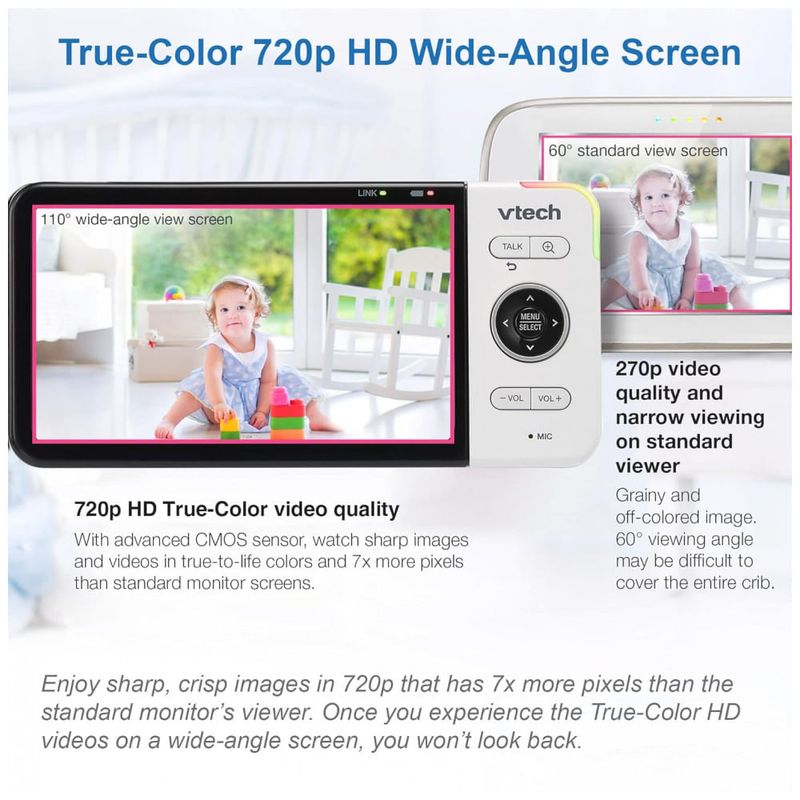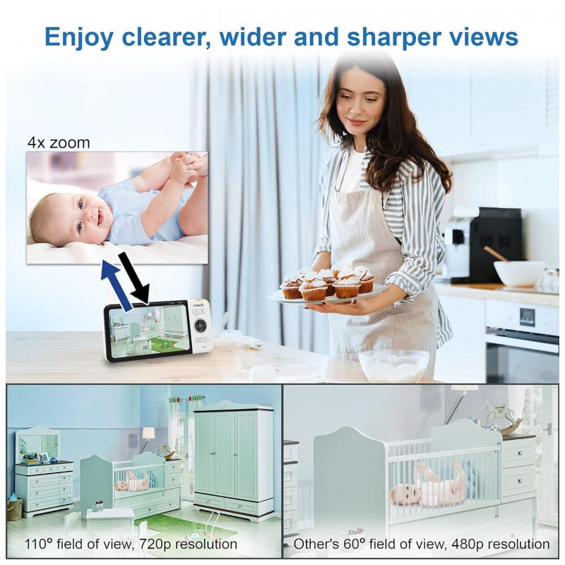 Veja os mínimos detalhes na tela HD de 720p Veja claramente cada pequeno movimento do seu bebê na tela grande de 5, em alta definição de 720p. Desfrute de vídeo nítido e em cores reais durante o dia e visão noturna ultrabrilhante e sem brilho durante a soneca do bebê Com a lente grande angular de 110 graus embutida, você pode verificar o seu bebê, bem como todo o berçário sem esforço.