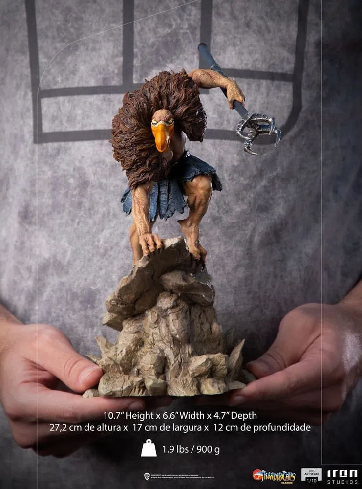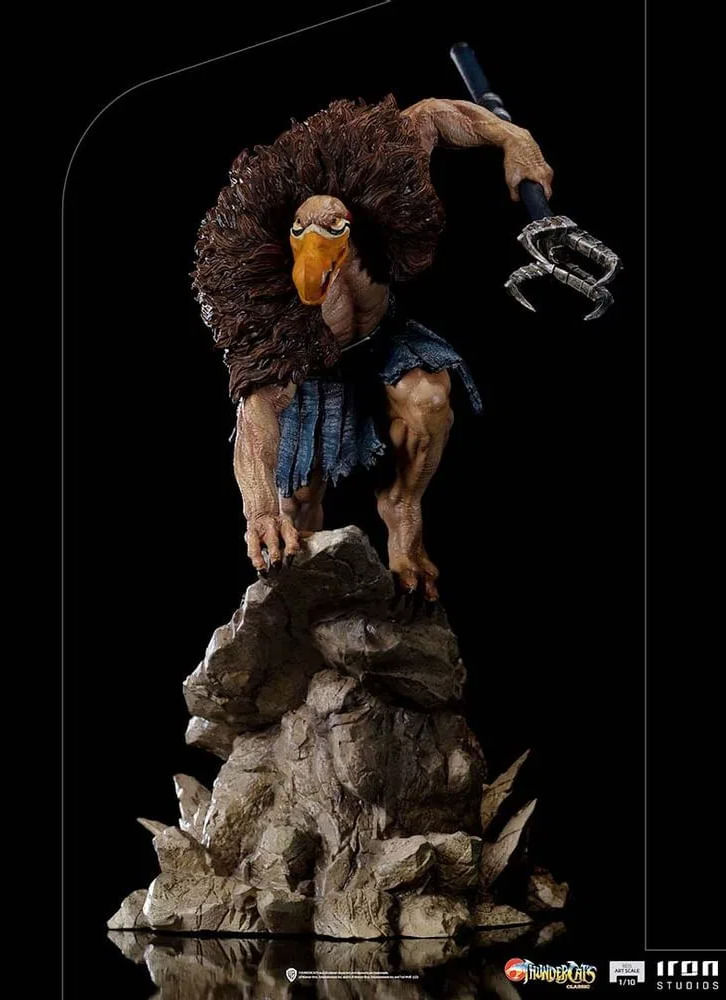 Como a ave de rapina com a qual possui semelhança e tem seu nome derivado, a antropomórfica criatura de bico longo e com o dorso coberto por longos pelos marrons ao invés de penas, posa no alto de uma base rochosa do planeta conhecido como Terceiro Mundo (Third Earth), observando com seu olhos astutos e empunhando seu cajado ou lança com a ponta em forma de garras. Outro nativo das diferentes raças de seres animalescos do planeta Plun-Darr, a estátua "Vultureman - BDS ThunderCats - Art Scale 1/10" da Iron Studios traz o astuto e dissimulado cientista e inventor membro dos inimigos dos ThunderCats conhecidos como Mutantes.