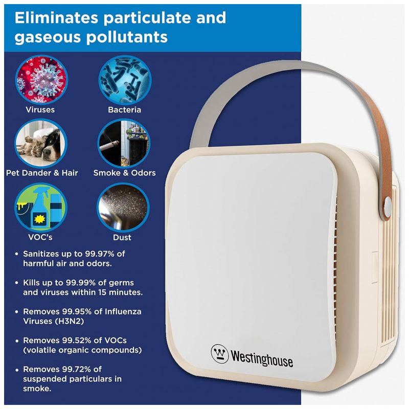 MATA E ELIMINA Enquanto outros purificadores apenas prendem e zenam poluentes prejudiciais, o Purificador de Ar Westinghouse elimina germes, alérgenos e elimina VOCs, fumaça, odores e até resquícios de gotículas de saliva presentes por conta de espirros e tosses e com Oxigênio Ativo