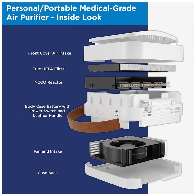 PURIFICADOR PORTÁTIL PODEROSO Pesando apenas 907 g, este purificador de ar portátil pessoal vem com uma pulseira de tecido e couro Ele pode limpar o ar de 99 dos poluentes do ar em qualquer espaço por até 8 horas com uma única carga