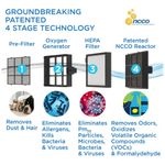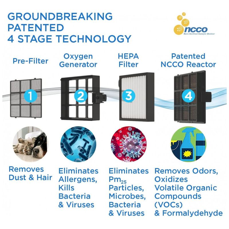 TECNOLOGIA NCCO PATENTEADA DE QUALIDADE MÉDICA O reator NCCO patenteado decompõe todos os poluentes gasosos VOCs, odores, fumaça e contaminantes com Oxigênio Ativo e os converte em compostos inofensivos, dióxido de carbono e moléculas de água poluentes presos vírus, bactérias, alérgenos no filtro HEPA se tornarão inertes