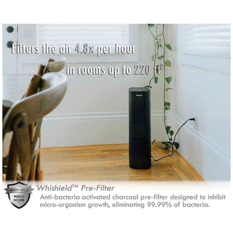 Tamanho Grande Cor Preto. Último modelo Purificador de ar Whirlpool Wpt80 Whispure Large Tower, para salas grandes com até 20 metros quadrados classificação AHAM, este purificador de ar possui controles eletrônicos de toque suave, 3 velocidades de ventilador baixa , média , alta , incluindo o modo de suspensão para operação silenciosa, economizando energia com classificação de estrela energética, temporizador programável 2, 4, 6, 8 h. e temporizador de filtros. O verdadeiro filtro HEPA captura 99. 97 de partículas tão pequenas quanto 0. 3 mícrons. Remove alérgenos no ar, como poeira, pêlos de animais, pólen, fumaça de tabaco, fibras de tecido e esporos de mofo. Um pré filtro de carvão ativado em whishield retém os odores e pré limpa o ar antes que ele atinja o filtro HEPA. A tecnologia Whishield inibe a proliferação de microrganismos no pré filtro, elimina mais de 99,9 dos germes e bactérias e impede que a contaminação secundária a jusante ocorra no pré filtro. O sistema silencioso Whispure oferece a mais silenciosa tecnologia de purificação de ar de alta eficiência. Cor Preto