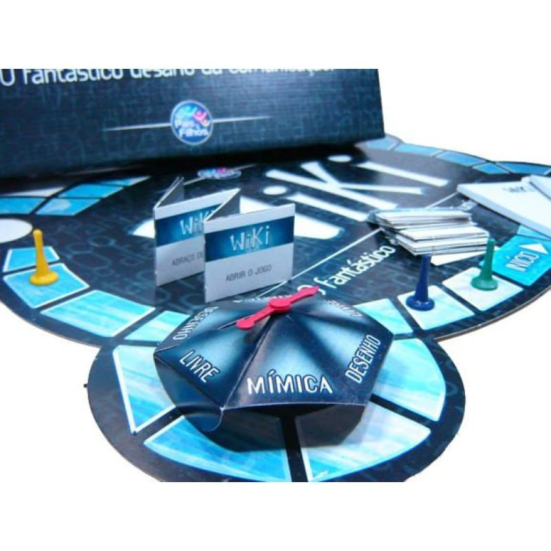 Jogo de tabuleiro Wiki Pais e Filhos, um jogo de desenhos e mímicas para divertir toda a família. Sorteia uma carta e passe a informação para seu parceiro através da mímica ou desenho, de acordo com a roleta. Vence aquele que se expressar melhor e mais rápido.