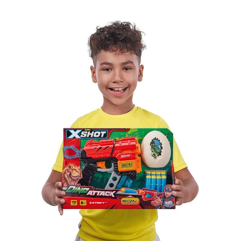 A diversão está garantida com o lançador X-Shot Dino Attack Extinct! Ele tem um design moderno e rápidos disparos de dardos que alcançam até 27 metros de distância! Você precisará ser rápido para acertar os ovos do Dino antes deles nascerem! Com o X-Shot Dino Attack Extinct você poderá acertar os alvos com mais precisão! Acompanha 1 ovo de dino e 8 dardos de espuma. O lançador é compatível com os principais dardos do mercado. Idade recomendada: 8+; Composição/Material: Plástico; Brinquedo depende de pilhas: Não; Brinquedo com luz: Não; Brinquedo com som: Não; Dimensões da embalagem: 30x21x6 cm; Peso: 0,6 kg; Código de Barras: 7897500555764; Garantia do Fornecedor: 3 Meses contra defeito de fabricação;