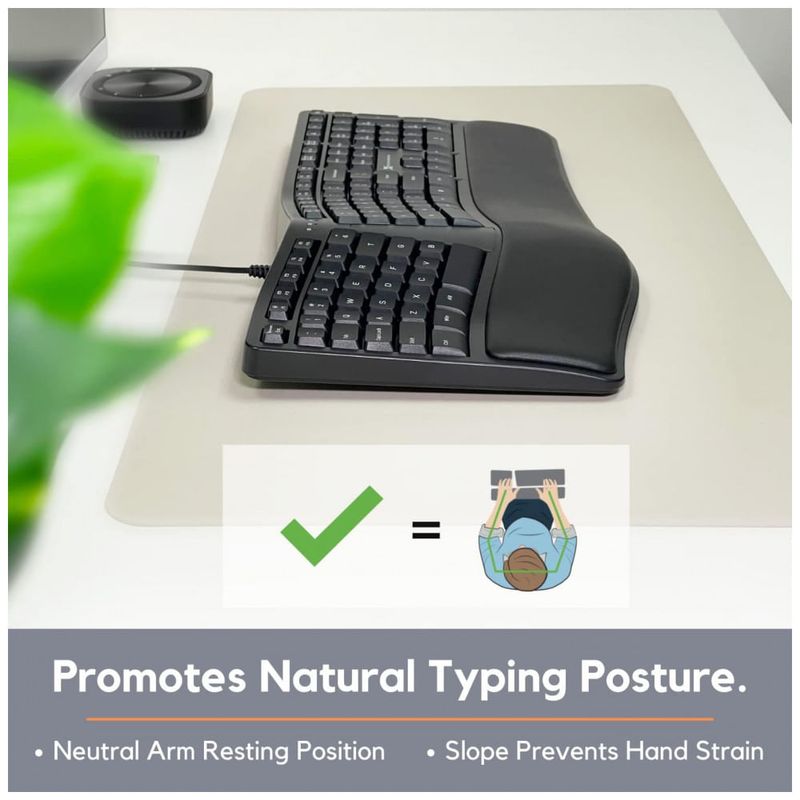 Design Ergonômico Dividido Posicionamento Natural Ao contrário de um teclado de laptop tradicional que faz com que suas mãos digitem em uma posição estranha, nosso teclado de onda promove uma posição natural da mão para menos tensão e fadiga.