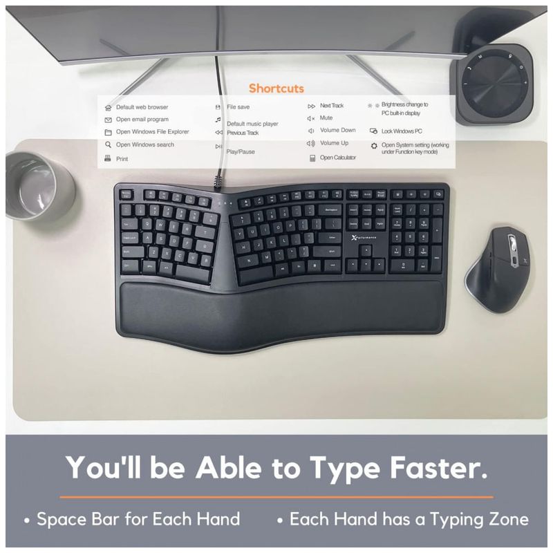 Teclado Ergonômico Dividido com Fio Recarregável Reduz a Tensão das Mãos com Teclas Programáveis, X9 PERFORMANCE X9ERGOKEY, Preto
