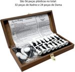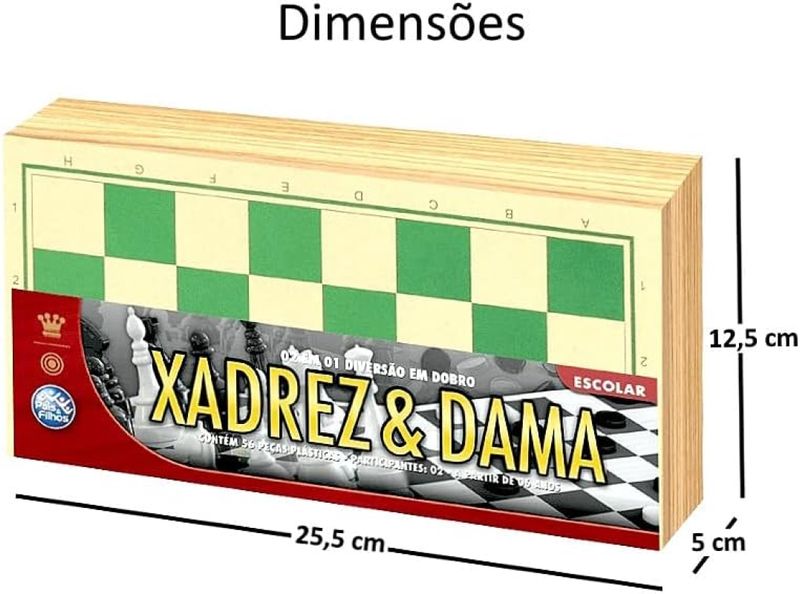 - Conteúdo da Embalagem: 1 Tabuleiro dobrável em madeira, 24 Peças de Dama, 32 Peças de Xadrez