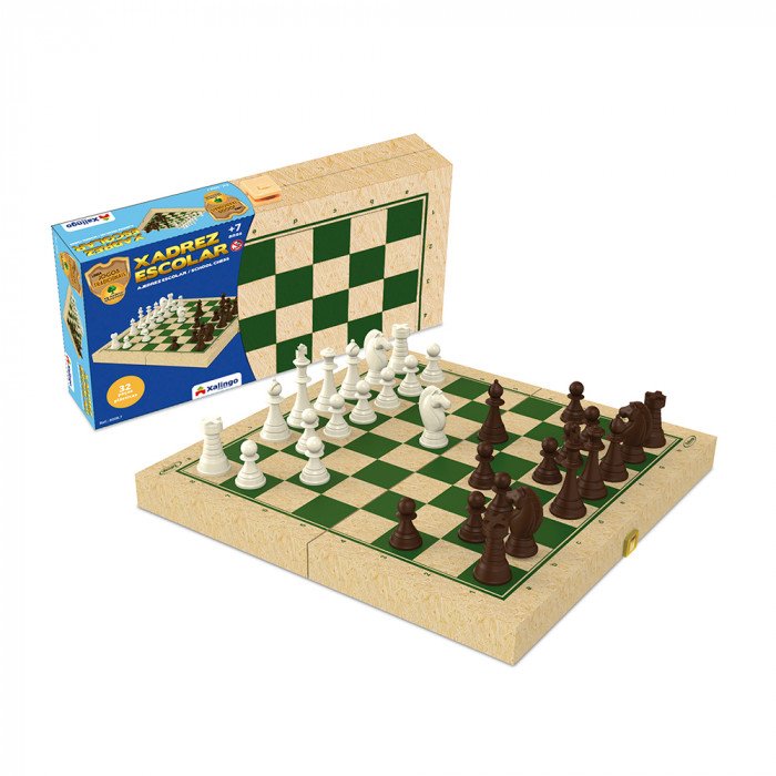 O jogo de Xadrez Escolar da Linha Jogos Tradicionais da Xalingo com o tabuleiro confeccionado em madeira reflorestada, medindo 27 x 27 cm e tinta atóxica, possui 32 peças plásticas com Rei com 5,6 cm foi especialmente desenvolvido para os apaixonados por jogos de tabuleiro. Contribuem para o raciocínio lógico e desenvolvimento da coordenação motora. Indicado para crianças acima de 7 anos.