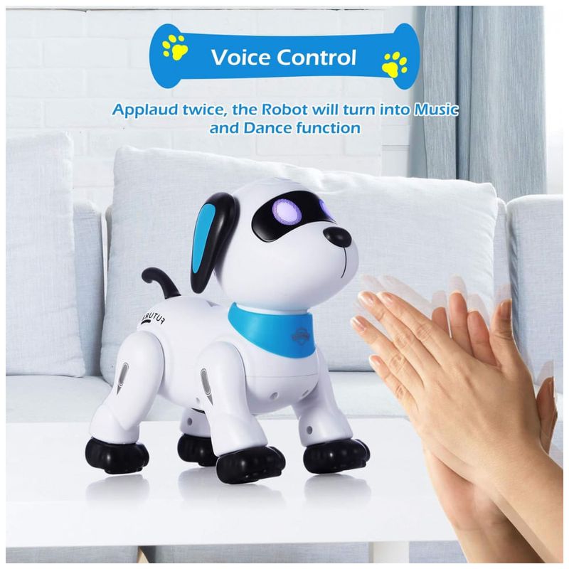 Controle Remoto e por Voz Aplausos Cão Robô de Controle Você pode brincar de cachorro com dois modos. 1, controle remoto infravermelho com alcance de controle 33 pés. 2, controle de voz aplauda duas vezes. Através do controle de voz, o cão robô pode dançar com 3 músicas diferentes. Robôs de brinquedo excelentes para crianças.