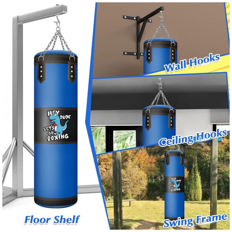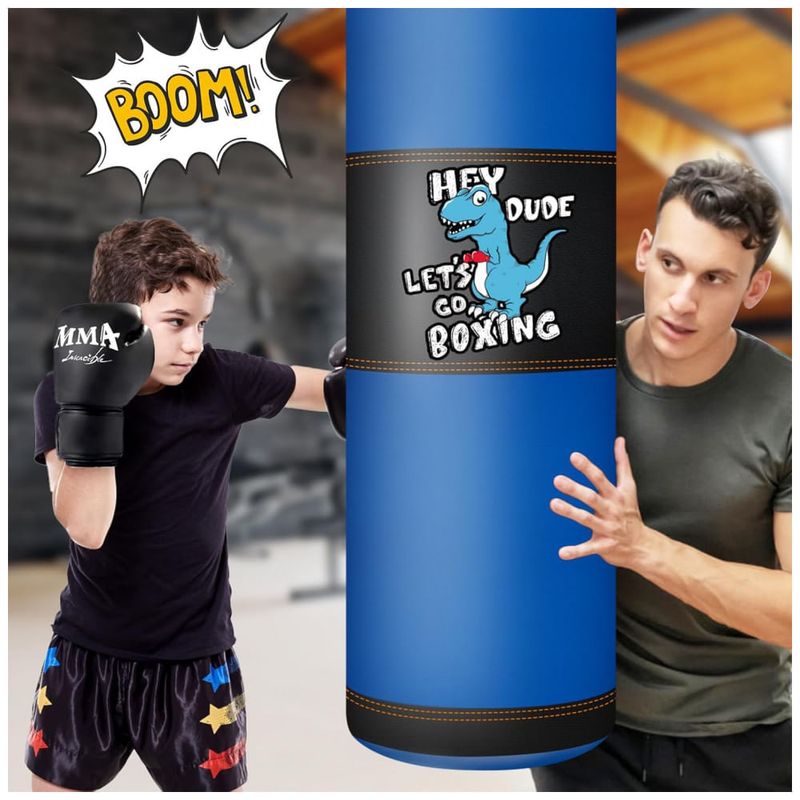 O Kit de Boxe Infantil YORWHIN oferece um conjunto completo e de altíssima qualidade para crianças se divertirem praticando boxe, kickboxing, karatê, muay thai e taekwondo. Inclui um saco de pancadas suspenso de 82 cm (2.7 pés) - que vem vazio para que você possa preencher com materiais diversos, como areia, tecido velho ou espuma, garantindo a segurança e personalização do peso (recomenda-se não ultrapassar 20 kg) -, um par de luvas de boxe de 170g (6 oz) feitas com espuma extra grossa e couro sintético resistente que protegem as mãos das crianças, além de bandagens para as mãos que oferecem suporte extra às articulações. O saco é confeccionado com uma estrutura multilayer em tecido Oxford e couro PU, projetada para absorver impactos e proteger os pulsos e articulações dos pequenos durante os treinos. O conjunto ainda traz todos os acessórios necessários para fixação: corrente para pendurar, gancho de expansão e mosquetão resistente, facilitando sua instalação no teto ou na parede. Com formato divertido de dinossauros, este kit estimula a coordenação motora, melhora a precisão de chutes, socos e joelhadas e promove o desenvolvimento físico e a disciplina dos jovens atletas. Leve, portátil e ideal como presente que alia diversão e atividade física, o YORWHIN Kit de Boxe Infantil é perfeito para treinos em casa ou em academias, incentivando a prática de esportes de maneira segura e agradável para crianças de diferentes idades.