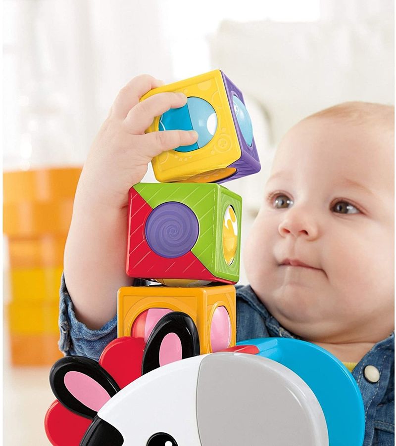 O bebê também pode empilhar os blocos na cabeça da zebra ou simplesmente bater os blocos para se divertir girando os vários lados coloridos!